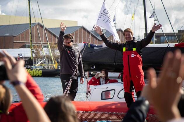 Le skipper Laurent Bourgues (à gauche) et son co-skipper Arnaud Vasseur, au moment de mettre le cap sur le large. | THIBAUD VAERMAN
