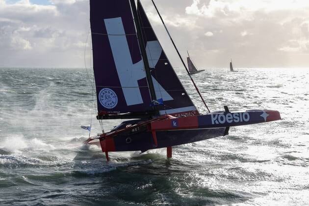 La veille du départ des autres classes de bateaux (Ultim, imoca, Class40). Ici sur la photo, Koesio (Skipper Erwan Le Roux, co-skipper Audrey Ogereau) PHOTO : DAVID ADEMAS / OUEST-FRANCE | DAVID ADEMAS / OUEST-France